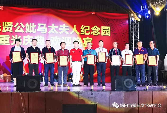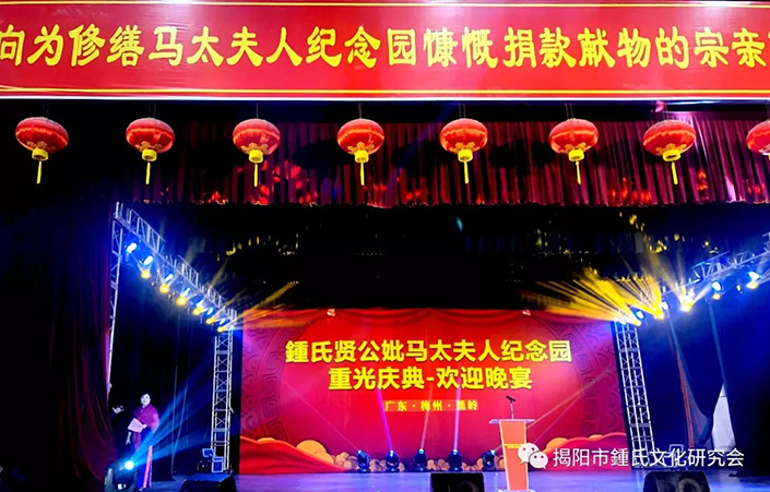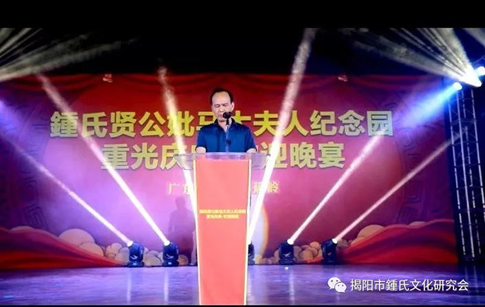 物有报本之心,人有思祖之情。金秋时节,风和日丽,今天,我们怀着万分激动的心情,相聚于美丽的客家之乡——蕉岭,共同参加马太夫人墓园重光庆典,缅怀先祖仁德,祈佑裔孙荣昌,这是鍾氏文化发展中的一件大喜事,一个里程碑!在此,我谨代表广东揭阳市鍾氏文化研究会,预祝马太夫人墓园重光庆典取得圆满成功!向百忙之中前来参加活动的各位宗长、宗亲们致以诚挚的问候和美好祝福!向组织本次庆典活动付出辛苦劳动的工作人员和宗亲们表示崇高的敬意!