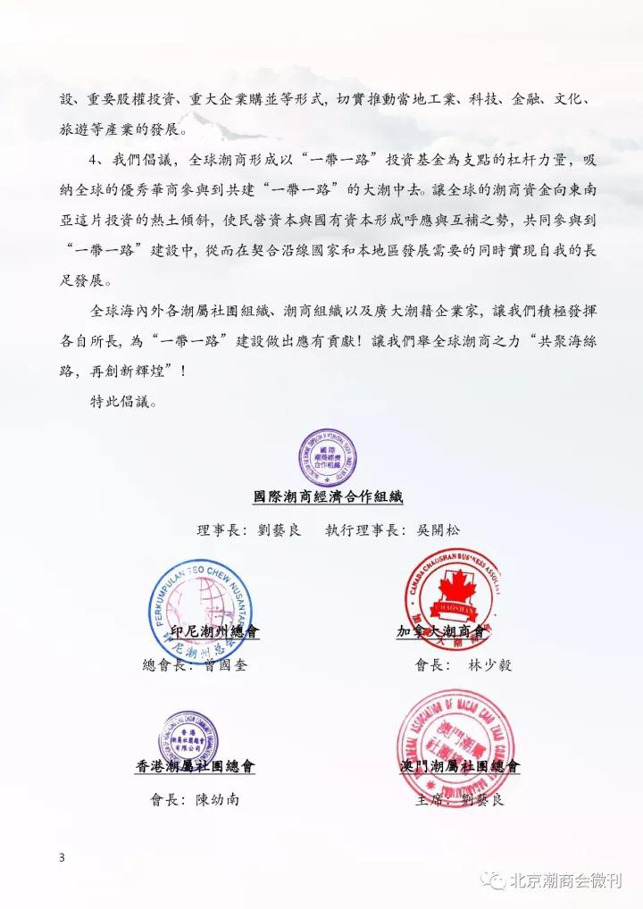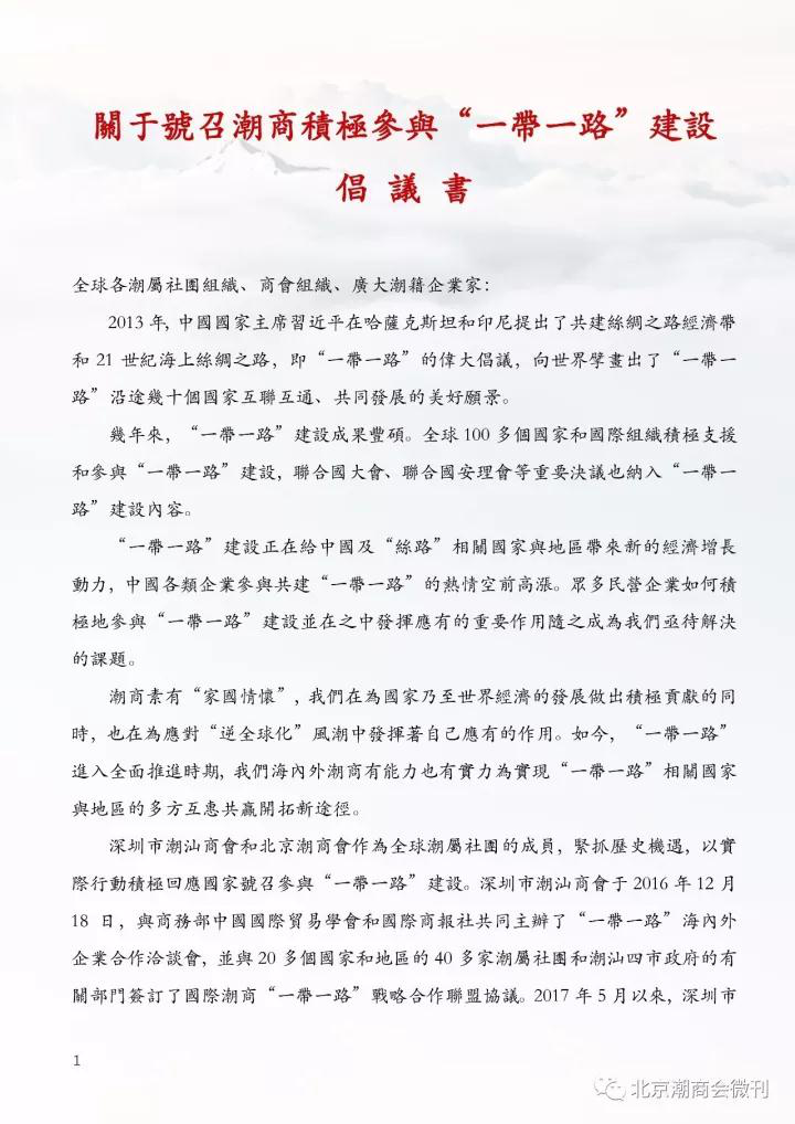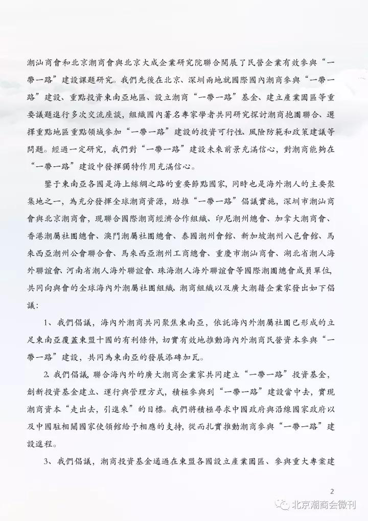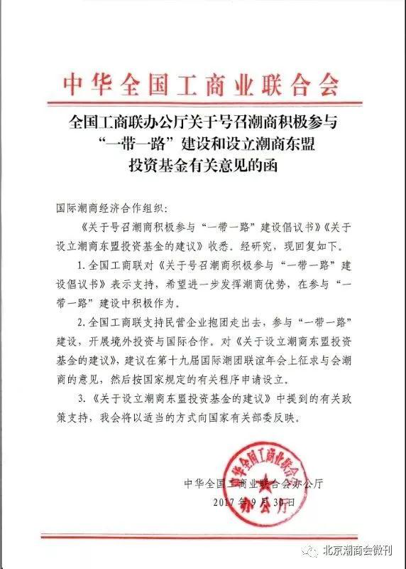 本次预备会议上增加了一个重要的会议环节——由北京潮商会与深圳市潮汕商会联合国际潮商经合组织、印尼潮商总会等15家海内外潮属社团一同发起的《关于号召潮商积极参与“一带一路”建设倡议书》的议程,本倡议得到全国工商联的鼎力支持,并下发了批复文件——《全国工商联办公厅关于号召潮商积极参与“一带一路”建设和设立潮商东盟投资基金有关意见的函》。